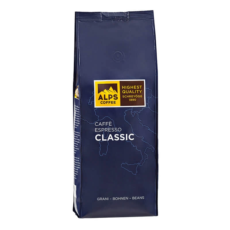Der Classic von Alps Coffee ist eine Mischung aus 60 % Arabica Bohnen und 40 % Robusta Bohnen. Die Arabica Bohnen stammen aus Südamerika und Afrika, die Robusta Bohnen aus Afrika und Südasien. Die Mischung ist rassig, kräftig und dunkel geröstet. Die Robusta Bohnen verleihen dem Espresso sein intensives Aroma. Perfekt geeignet als klassischer Espresso aber auch als Cappuccino.