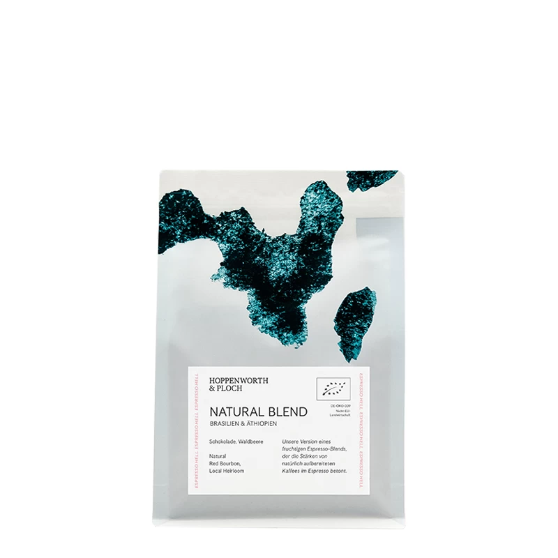Der Natural Blend von Hoppenworth & Ploch ist eine Espressomischung aus 100 % Arabica Bohnen verschiedener Herkunft. Als Blend (im Gegensatz zum Single Origin) bezeichnet man Röstungen, die auf einer Mischung verschiedener Kaffeebohnen hinsichtlich Herkunft und Sorte basieren. Die Bezeichnung „Natural“ hingegen bezieht sich auf die Aufbereitung der Kaffeebohnen, bzw. Kaffeekirschen, zwischen Ernte und Röstung. Bei der natürlichen oder trockenen Aufbereitung werden die Kaffeekirschen nach der Ernte getrocknet, bevor das getrocknete Fruchtfleisch vom Kern – der geliebten Kaffeebohne – entfernt wird. Durch den längeren Kontakt zwischen Kaffeebohne und trocknendem Fruchtfleisch bindet sich Zucker aus der Frucht an die Kaffeebohne, wodurch ein süßerer und oft fruchtigerer Geschmack entsteht. Zurück zum Natural Blend von Hoppenworth & Ploch: Dieser Espresso ist also eine Mischung aus trocken aufbereiteten Kaffeebohnen. In diesem Fall stammen die 100 % Arabica Kaffeebohnen aus Brasilien und Äthiopien.