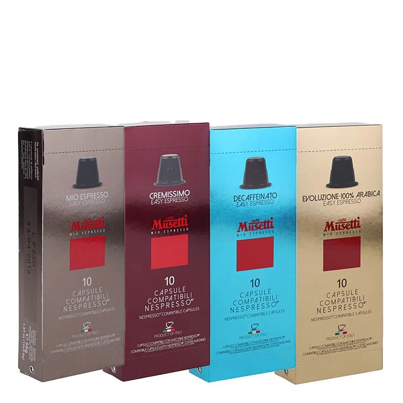 Musetti Decaffeinato – Perfekt für alle, die auf Koffein, aber nicht auf das volle Aroma echten italienischen Espresso verzichten möchten. Die Mischung der 10 Kapseln besteht aus 80% Arabica- und 20% Robustabohnen zeichnet sich durch ein cremiges, feines und süßes Aroma aus.